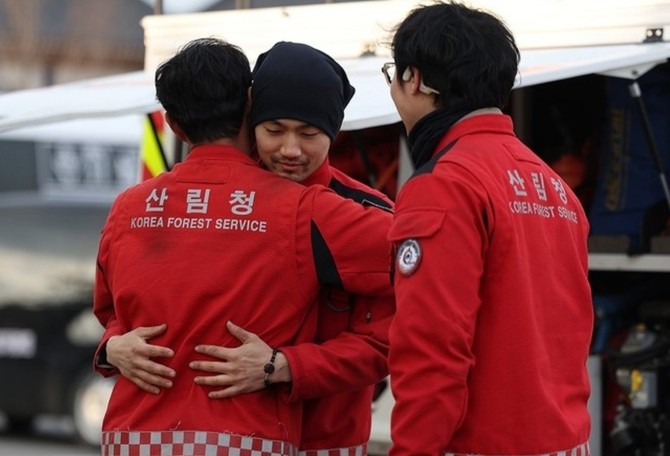 경북 산불의 주불 진화가 완료된 28일 경북 의성군 산림청 상황실 인근에서 산림청 산림항공본부 공중진화대 대원들이 산불 진화 완료를 자축하고 있다. ⓒ 연합뉴스