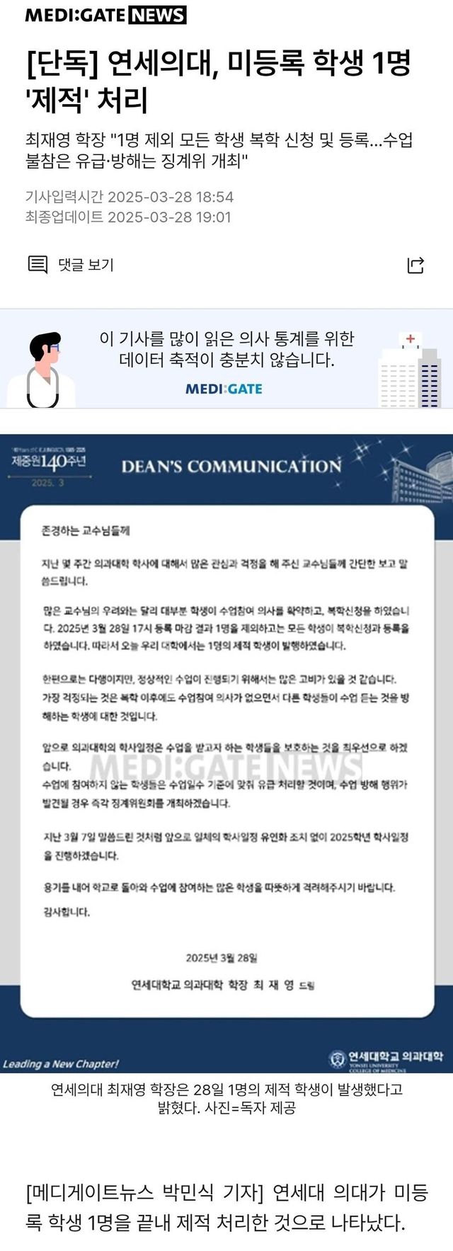 탈락자 1명MEDI:GATE NEWS [단독] 연세의대, 미등록 학생 1명 제적 처리