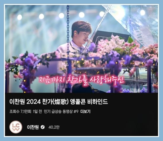 최근 이찬원의 공식 유튜브 채널(또튜브)에는 "이찬원 2024 찬가(燦歌) 앵콜콘 비하인드"라는 제목의 영상이 게재됐다.