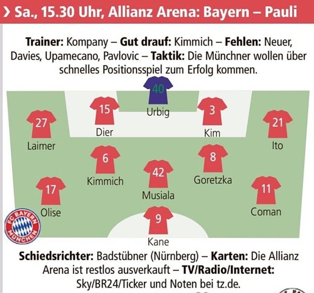 독일 매체 'TZ'는 바이에른 뮌헨과 장크트 파울리의 경기 선발 예상 명단에 김민재의 이름을 집어넣었다. 매체는 김민재아 다이어와 함께 센터백 포지션에서 호흡을 맞추고, 데이비스 대신 일본 출신 수비수 이토 히로키가 선발 출전할 것이라고 전망했다.