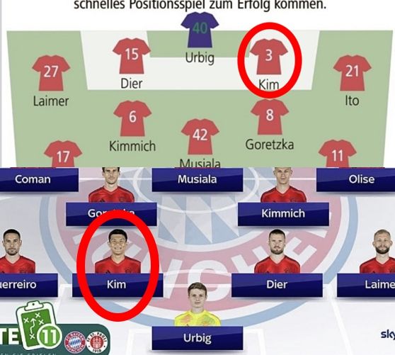 나머지 포지션은 이전과 동일하다. 부상당한 마누엘 노이어 대신 출전해 좋은 활약을 보여줬던 요나스 우르비히 골키퍼가 이름을 올렸고, 오른쪽 풀백 자리에는 콘라트 라이머가 배치됐다. 3선에는 고레츠카와 요주아 키미히, 2선에는 킹슬리 코망, 자말 무시알라, 마이클 올리세의 이름이 적혔다. 최전방은 해리 케인이다.