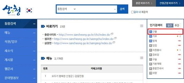 산청군 홈페이지 검색어 순위. (갈무리) / 산청군 홈페이지