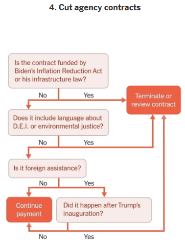 4. 개인 정보 뿐만이 아니라 도지는 정부계약의 취소에 중점을 두는데 해지하는 계약은 이처럼 걸러짐. 바이든의 인플레이션 감축법 관련, DEI, 해외원조에 관련되면 무조건 계약해지 대상.