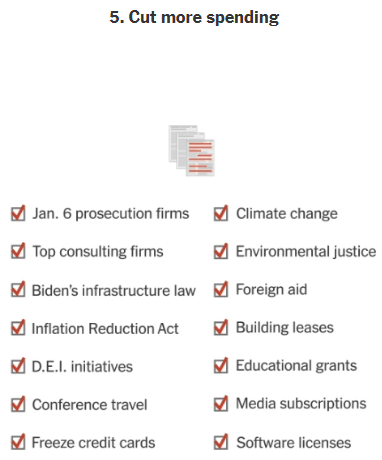 5. 지출을 더 자름. 이중에는 트럼프 반란행위 기소관련, 기후변화, 환경문제 관련 지출 계약을 무작위로 골라내어 파기함.