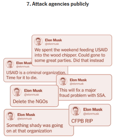 7. 지출 감축 발표 전에는 머스크가 소셜미디어 (X)로 미리 선동을 함.