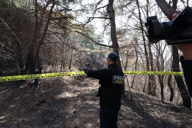 경북경찰청 형사기동대와 과학수사계가 29일 경북산불 최초 발화 추정 지점인 의성군 괴산리 야산에서 현장 조사를 하고 있다. / 연합뉴스