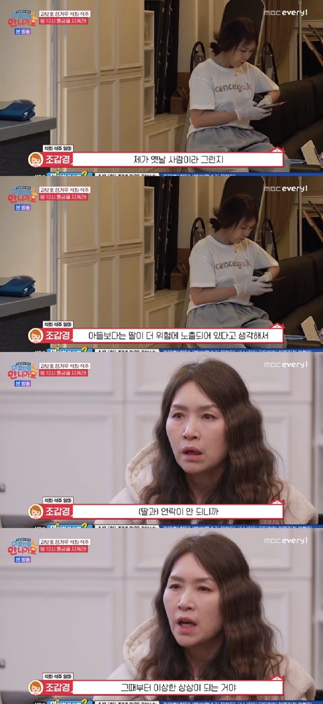딸이 전화를 받지 않자 조갑경은 얼굴이 굳어졌다. 그는 "제가 옛날 사람이라 그런지 아들보다는 딸이 더 위험에 노출되어 있다고 생각한다. (딸과) 연락이 안 되니까 그때부터 이상한 상상이 된다"고 속내를 털어놓았다.