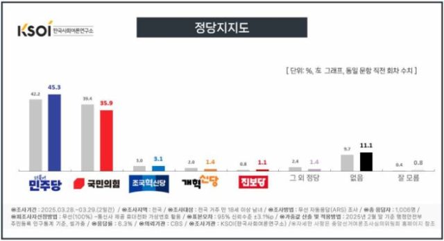 CBS노컷뉴스가 한국사회여론연구소(KSOI)에 의뢰해 30일 공개한 여론조사 결과에 따르면, 민주당 지지도는 45.3%로 집계돼 국민의힘(35.9%)보다 9.4%포인트 앞섰다.