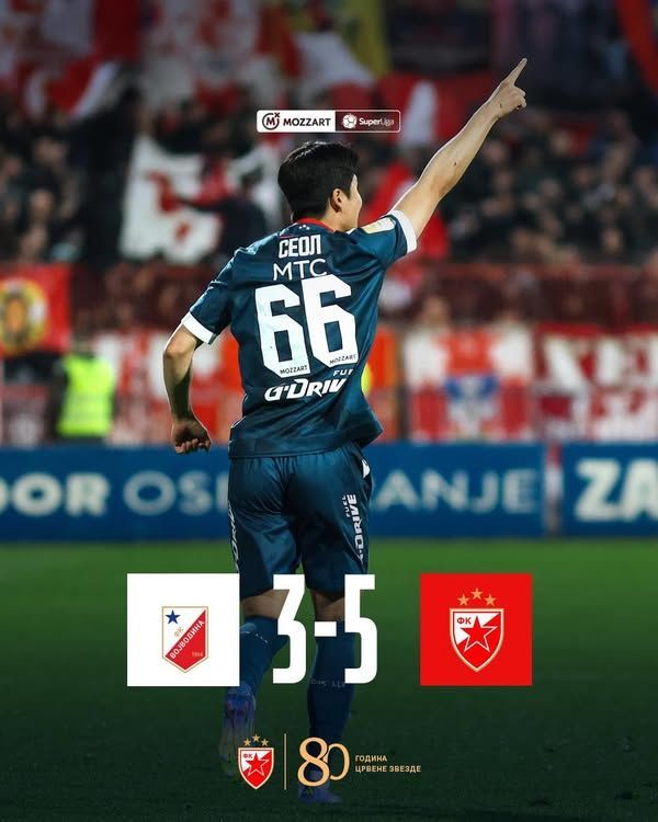 즈베즈다는 30일(한국시간) 세르비아 노비사드 카라조르제 경기장에서 열린 2024-2025시즌 세르비아 수페르리가 29라운드 보이보디나와 원정 경기에서 난타전 끝에 5-3으로 승리했다. 이날 승리로 무패 우승 타이틀에 한 걸음 더 다가선 즈베즈다다.