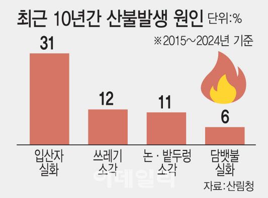법적으로 국립공원 등에서 흡연하거나 인화물질을 소유하면 과태료를 내야 한다. 산불을 실수로 내도 형사처벌을 받을 수 있다. 이번 영남권 산불도 대부분 실화로 발생했다. 경북 의성 산불은 성묘객 실화, 경남 산청 산불은 예초기 불씨, 울산 울주 산불은 용접 작업이 원인으로 추정되고 있다.