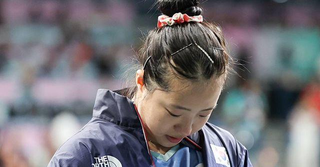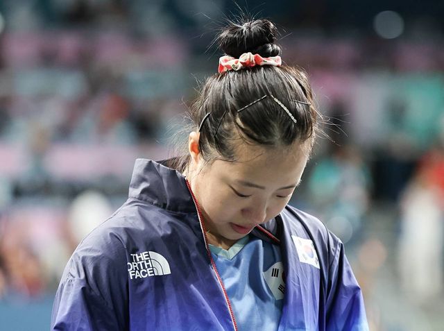 대한민국 탁구 대표팀 신유빈이 2024년 8월 3일(한국시간) 프랑스 파리 사우스 파리 아레나 4에서 열린 '2024 파리올림픽' 탁구 여자 단식 동메달 결정전 일본 히나 하야타와의 경기에서 패배한 후 경기장을 나서고 있다 / 뉴스1