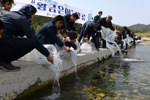 황금은어의 개체 수를 유지하고 유전적 특성을 보존하기 위해 영덕군과 지역 보존회는 매년 치어 방류 사업을 진행하고 있다. 자연산 성어를 포획하여 알을 받아 수정 과정을 거친 후 지역 내 주요 하천에 치어를 방류하는 방식이다. 예를 들어 지난해에는 약 90만 마리의 치어를 생산하여 그중 60만 마리를 방류했다. 이러한 노력은 황금은어의 지속적인 생존과 번영에 크게 기여하고 있다.