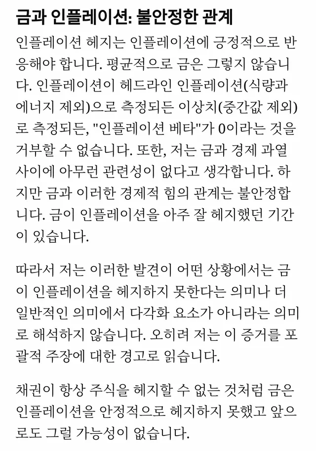 닉슨 쇼크 이후의 금은 사실상 다른 자산들과 연결고리가 끊어진 상태라 본질 자체는 투기용 원자재라 봐도 무방하다고 생각해오