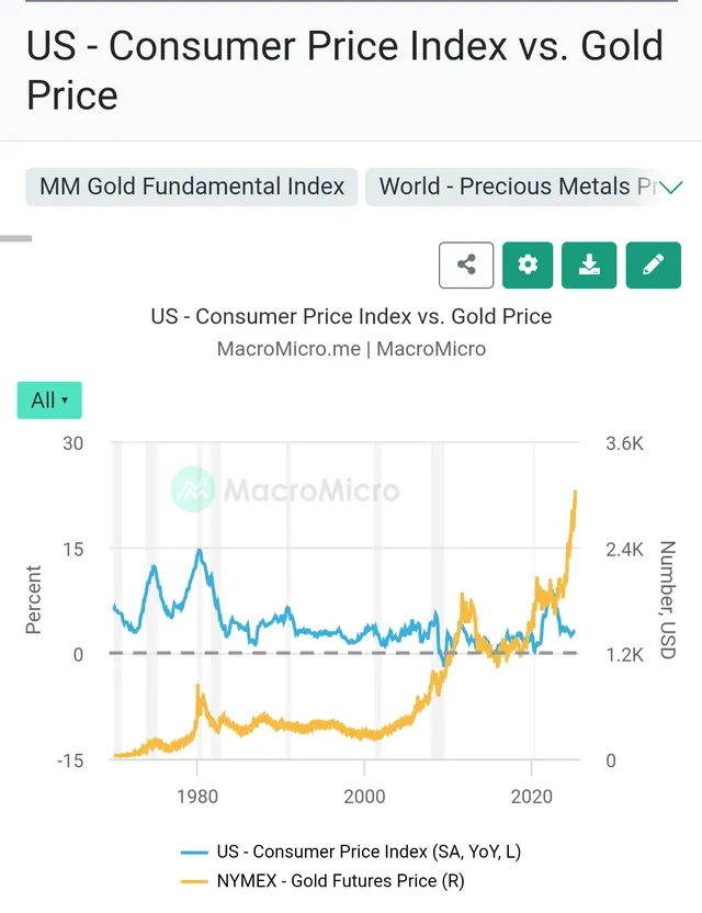 1971년 금태환 중지 이후로 인플레이션과 따로 놀고있음