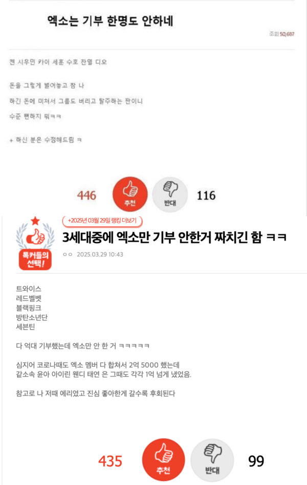그러나 일부 온라인 커뮤니티에서는 이들의 기부 금액을 두고 "고작 그거냐" "셋이 합쳐서 3천만원이라니" 등의 악성 댓글이 달렸다. 선한 의도로 시작된 기부 활동이 악플로 인해 빛이 바래는 상황이 연출된 것이다.