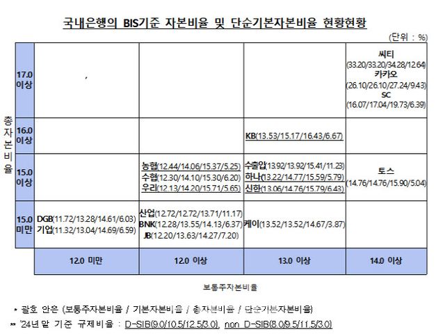 보통주자본비율 기준으로는 씨티·SC·카카오·토스 등은 14% 이상, KB·하나·신한·수출입·케이 등이 13% 이상으로 상대적으로 높다.