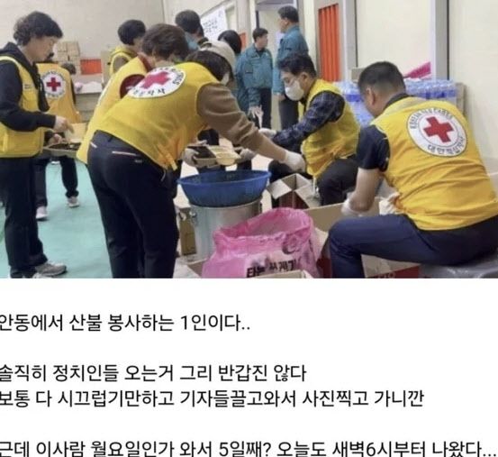 A씨는 “안동에서 산불 봉사하는 1인이다. 정치인들 오는 거 그리 반갑진 않은데, 이 사람 며칠째 오늘도 새벽 6시부터 나왔다”며 “국회의원이 새벽부터 밤까지 사람들 밥 퍼주고 짬(음식물 쓰레기를 뜻하는 은어) 버리고 있다”며 원 전 장관의 사진을 게재했다.