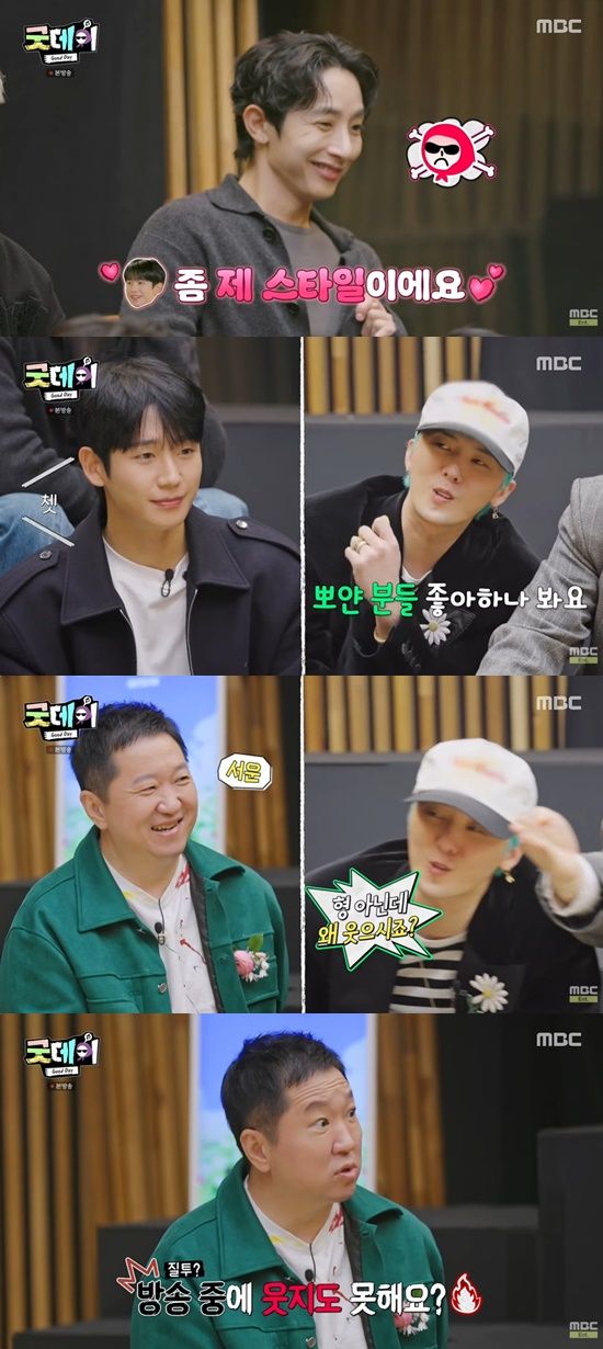 지드래곤은 정해인에 대해 "좀 제 스타일이다. 제가 약간 좀 이렇게 미소년, 뽀얀 분들을 좋아한다"고 말했다. 이에 정형돈이 헛웃음을 짓자 "형 아닌데 왜 웃으세요"라고 말했고, 정형돈은 "아니 그럼 방송 중에 웃지도 못해요?"라고 발끈해 웃음을 줬다.