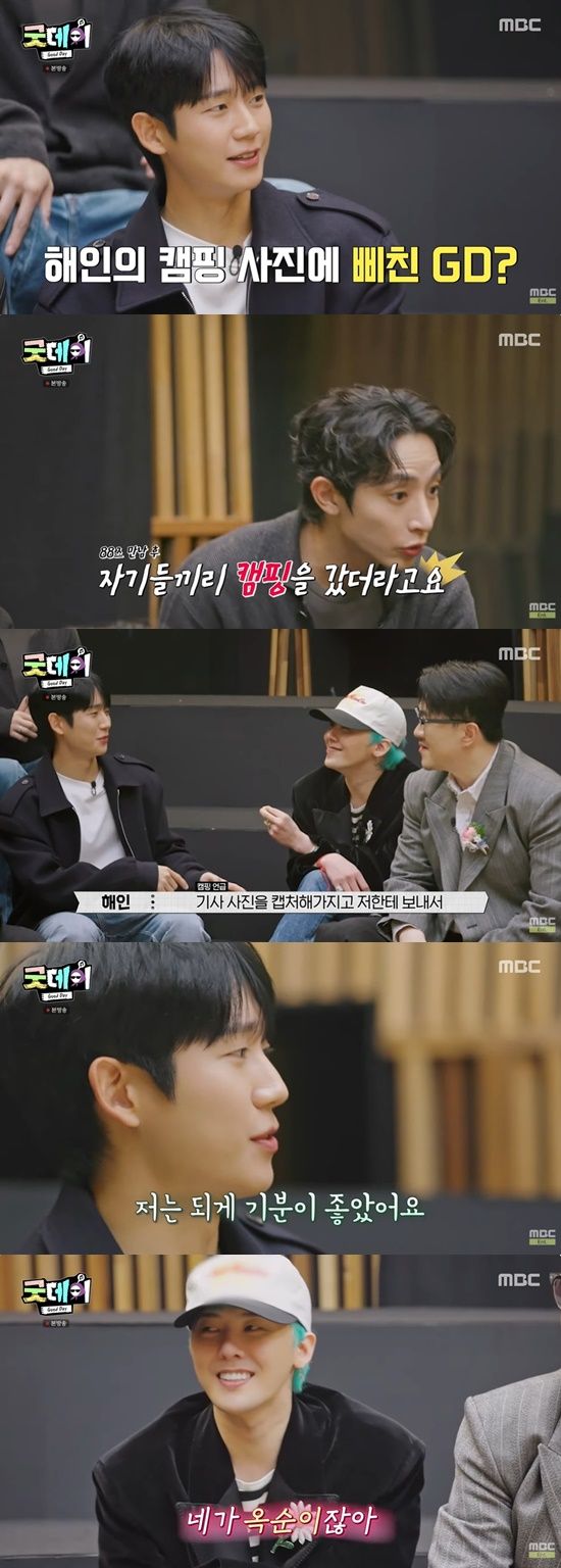 정해인은 "그래서 개인적으로 지용이가 캠핑을 언급한 기사 사진을 캡처해서 저한테 보냈더라. 저는 되게 기분이 좋았다. 어쨌든 되게 관심을 갖고 있다는 뜻 아닌가"라고 이야기했다.