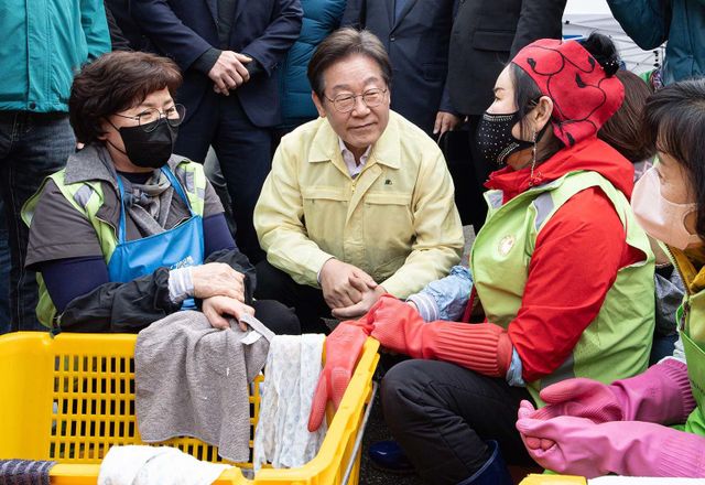 이재명 더불어민주당 대표가 28일 오후 경남 산청군 시천면 산불현장지휘소를 찾아 자원봉사자들을 격려하고 있다. / 뉴스1