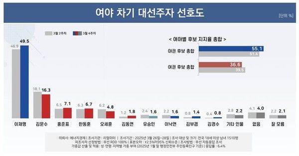 여론조사회사 리얼미터가 에너지경제신문 의뢰로 지난 26일부터 28일까지 전국 만 18세 이상 1510명을 대상으로 여야 차기 대선주자 선호도를 물어본 결과, 이 대표 49.5%, 김문수 고용노동부 장관 16.3%, 홍준표 대구시장 7.1%, 한동훈 전 국민의힘 대표 6.7%, 오세훈 서울시장 4.8% 순으로 나타났다.