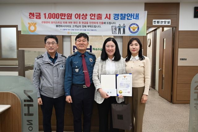 오산농협 남촌동지점에 근무하는 A씨는 앞선 2월 25일 현금 3,000만원을 인출하여 다른 계좌로 이체하려는 대상자를 발견하고 보이스피싱이 의심스러워 송금 지연 및 계좌 지급 정지 후 신속하게 112에 신고하여 범죄 피해를 예방했다.