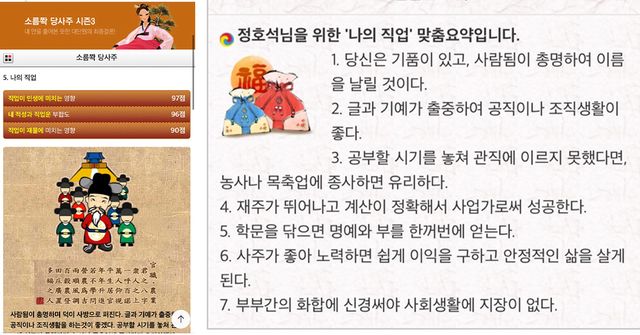 온라인 사주 전문 사이트 '위키사주'는 오랜 전통을 바탕으로 한 사주팔자와 현대적인 분석 기술을 결합하여 각자의 운명을 상세히 분석한다. 이름과 생년월일, 태어난 시간과 성별을 입력하면 간단하게 이용할 수 있다. 만사형통 내 운명의 비밀 사주, 쓸모있는 사주 감정, 복잡한 세상 편하게 사는 소름돋는 비법 사주까지 다양한 운세를 재미있게 점칠 수 있다.
