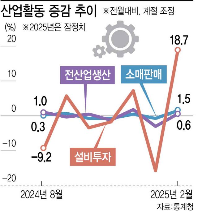 소비를 보여주는 소매판매는 1.5% 늘었다. 승용차 등 내구재 소비 상승폭이 13.2%로 두드러졌다. 지난해 2월 말부터 시작된 전기차 보조금 집행이 올해는 2월 초부터 이뤄지면서 조기 집행에 따른 승용차 판매가 크게 증가한 영향으로 보인다.