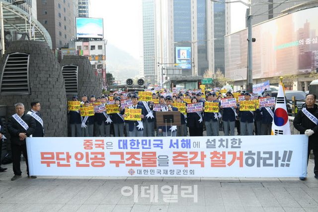 이날 중국 대사관 앞 집회에는 재향군인회 본회와 서울시회 등에서 200여명의 회원이 참가했다. 이들은 현수막과 피켓을 들고 무단 인공구조물 설치와 중국의 주권침해를 규탄했다.