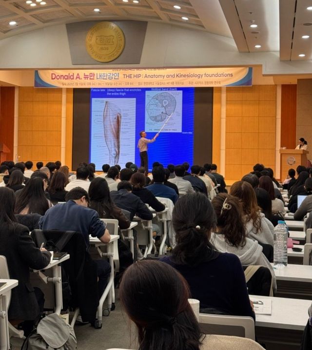 뉴만 교수는 근골격계의 근육과 관절 간 움직임, 생체역학적 상호관계에 관한 연구를 오랫동안 진행해 온 전문가로, 특히 이번 강연에서는 고관절과 허리골반의 운동역학, 하지의 기본 구조와 기능 이해에 초점을 맞춘 심도 있는 내용을 전달했다.