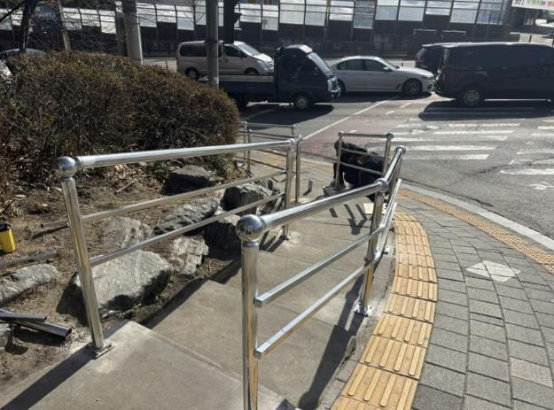 해당 장소는 우만주공4단지 앞 퉁소바위사거리 횡단보도로 급경사이다. 이곳은 급경사임에도 난간이 설치되어 있지 않아 특히 겨울철 보행자의 안전이 크게 우려되는 곳이었다.