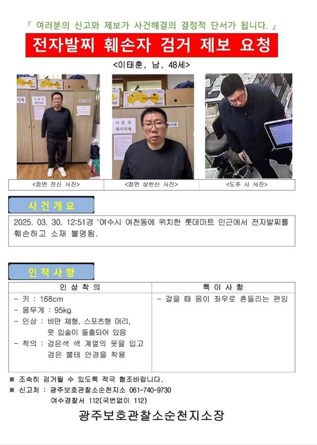 이씨는 전날 낮 12시 51분쯤 전남 여수시 여천동의 한 마트 화장실에서 전자발찌를 끊고 도주했다. 이를 인지한 법무부 산하 광주보호관찰소가 경찰에 신고했고, 인근 여수·순천경찰서에서 추적에 나섰다.