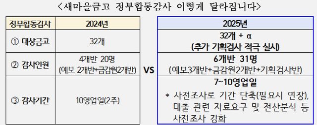 감사 대상인 32개 금고와 별도로 △직장 내 성비위 및 갑질 발생 △부당대출 확인 △출자배당 이행명령 미준수 등 긴급하게 감사가 필요한 금고는 기획검사를 통해 즉시 대응할 계획이다.