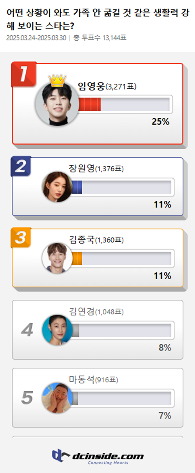 최근 커뮤니티 포털사이트 디시인사이드가 '어떤 상황이 와도 가족 안 굶길 것 같은 생활력 강해 보이는 스타는?'으로 투표를 한 결과 임영웅이 1위에 올랐다. 이 투표는 지난 24일부터 30일까지 총 7일간 진행했다.
