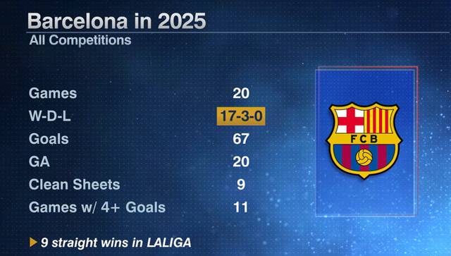 올 시즌 바르셀로나의 공격 축구는 계속된다. 바르셀로나는 이날 승리로 올 시즌 공식전 45경기 중 무려 20차례나 한 경기 4득점 이상을 해냈다. 바르셀로나는 공식전에서 139골을 넣었는데, 이는 경기당 3골 이상 넣었다는 의미다. 2025년 이후로는 공식전 20경기 무패(17승 3무). 라리가에선 9연승을 질주 중이다.