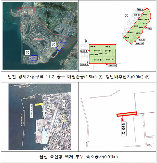 지난해 공유수면 매립을 통한 국토면적 증가 사례. 인천경제자유구역 11-2공구 (상단) 및 울산 북신항 액체 부두 축조공사. 사진=국토교통부 제공