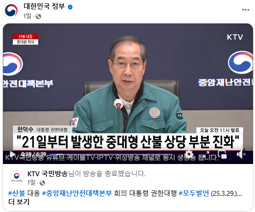 한 권한대행은 "밤낮없이 화마와 사투를 벌인 산불진화대, 산림청·소방청·지자체 공무원, 군 장병들의 헌신 덕분에 전례 없는 대형 산불을 진화할 수 있었다"고 말하고, "아직 잔불이 살아날 위험은 여전히 남아있는 만큼 지금부터는 불길이 되살아나지 않도록 뒷불 감시에 집중해야 한다"고 강조했다.