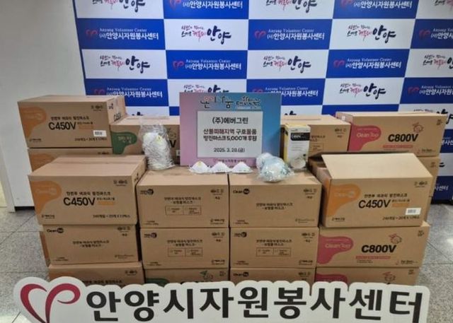 [와이뉴스] 안양시는 마스크 제조기업 ㈜에버그린이 영남지역 산불피해 복구와 이재민 지원을 위해 안양시자원봉사센터를 통해 방진 마스크 5천개를 기부했다고 31일 밝혔다.