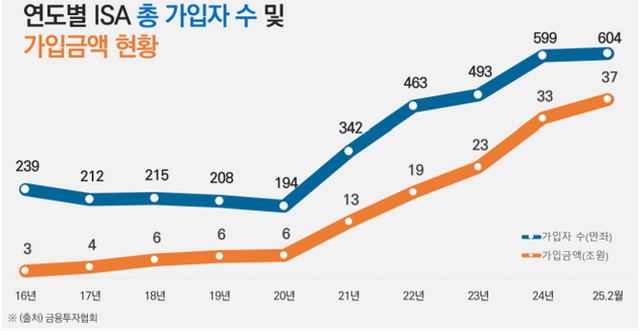 ISA의 가입자 수와 가입금액은 2021년 가입자가 직접 금융상품에 투자·운용할 수 있는 '투자중개형 ISA'가 도입된 이후 가파르게 증가하고 있다.