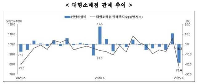 31일 통계청 제주사무소가 발표한 '2025년 2월 제주 산업활동동향'에 따르면 지난 2월 제주지역 대형소매점 판매액지수는 전년 동월 대비 18.3% 감소한 잠정 76.6(2020=100)으로, 역대 최저치를 기록했다. 지난 1월(106.1)과 비교해 한 달 사이 29.5p 하락했다.