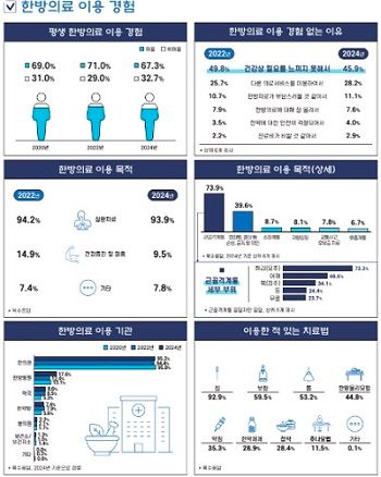 19세 이상 국민 10명 중 약 7명(67.3%)이 한방의료를 이용한 경험이 있는 것으로 나타났다. 이는 2022년 조사(71.0%)보다 3.7%p 감소한 수치다.