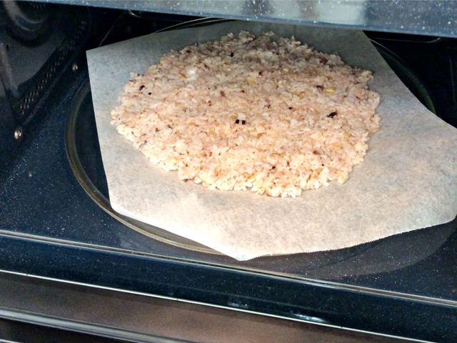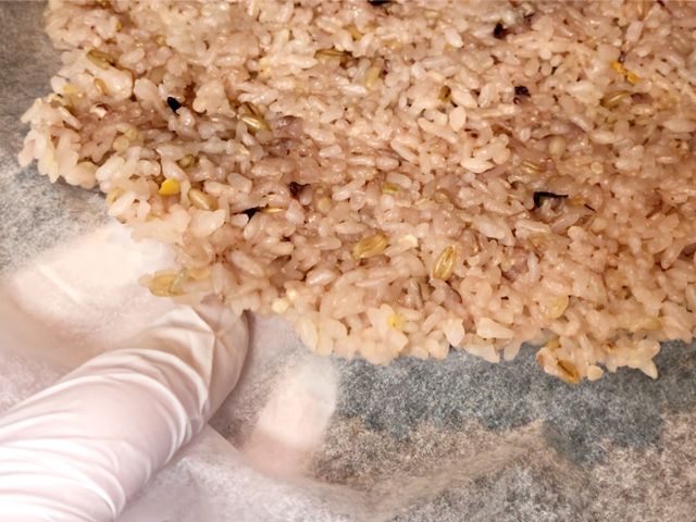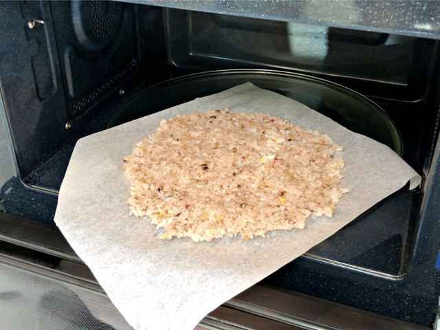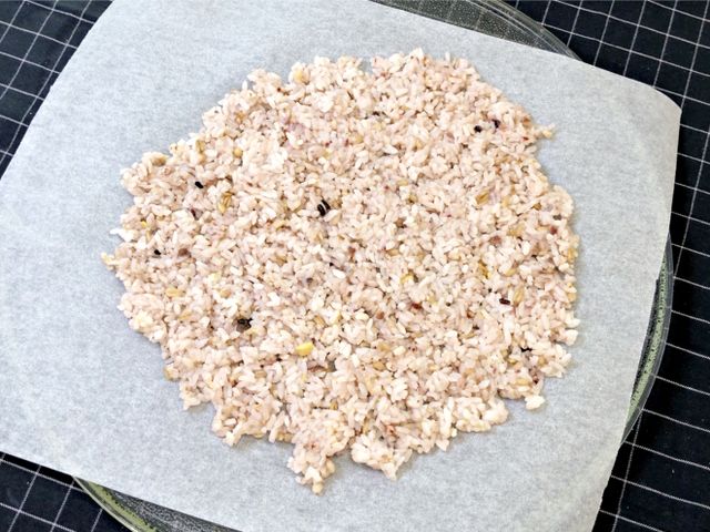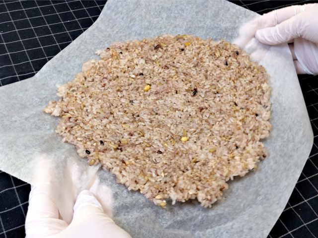종이호일 위에 밥을 넓적하게 펼쳐주세요.