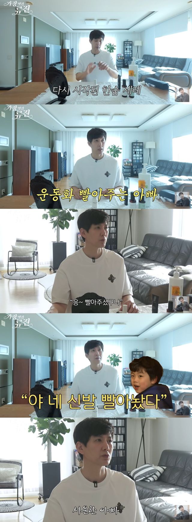 "통 안에 세재 넣어서 담가둔 다음에 건조 하면 어느정도 마르더라. 햇빛에 말라가는 걸 볼때 쾌감을 느낀다. 깨끗하게 해놓고 누구한테 가서 네 신발 빨아놨다고 하면 되게 뿌듯하다"며 아들 둘을 둔 아빠 면모를 드러냈다.