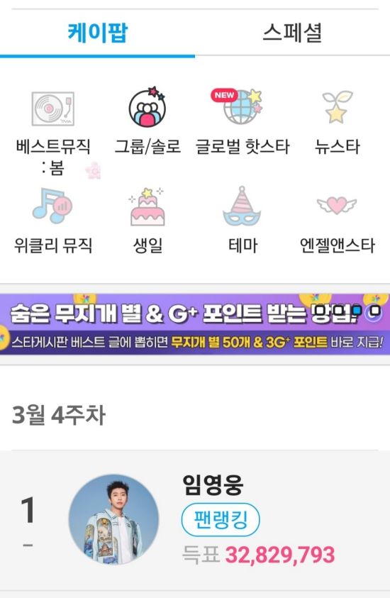 최근 '팬앤스타'에 따르면, 임영웅은 3월 4주 차 솔로가수 인기 랭킹 투표에서 1위에 등극했다.