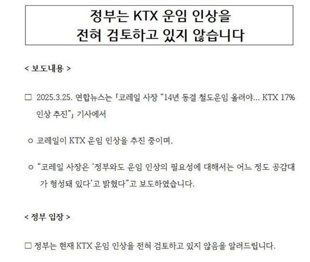 같은 날, 기획재정부와 국토교통부는 '정부는 KTX 운임 인상을 전혀 검토하고 있지 않다'는 제목의 설명자료를 통해 즉각 반박에 나섰다. 양 부처는 현재 운임 인상과 관련된 논의는 전혀 진행 중이 아니며, 철도운임 조정은 철도사업법 시행령에 따라 정부 인가 사항이라 신중하게 접근 중이라고 밝혔다.