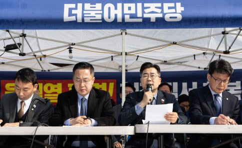 헌법재판소를 향해서도 비판이 이어졌다. 박 원내대표는 “헌재는 국민의 분노를 직시해야 한다. 탄핵심판 최후 변론이 끝난 지 오늘로 36일째가 됐다”며 “내란 세력 윤석열이 국회와 중앙선관위를 군 앞발로 짓밟는 장면을 본 국민은 지금의 침묵을 도저히 납득할 수 없다”고 목소리를 높였다. 그는 “헌법재판소는 즉각 윤석열 대통령의 파면을 선고하라”고 촉구했다.