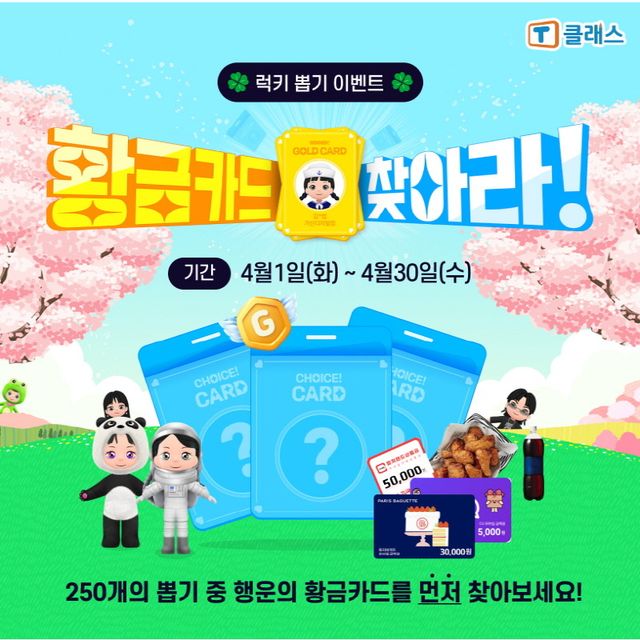 '황금카드를 찾아라’ 이벤트는 4월 1일(화)부터 4월 30일(수)까지 진행된다. 출석과 학습으로 4,000골드를 모아 뽑기권을 획득하면 250개의 카드 중 하나를 선착순으로 뽑을 수 있으며 이벤트는 1인 1회만 참여 가능하다. 선물 리스트는 △컬쳐랜드 상품권 5만 원 △파리바게트 3만 원 △교촌 치킨세트 △CU 상품권 5천 원 △메가커피 딸기쿠키프라페의 기프티콘과 △우주탐험대 △개굴개구리 △Y2K 코스튬 △바오 프렌즈의 마이홈 아이템이 준비되어 있다.