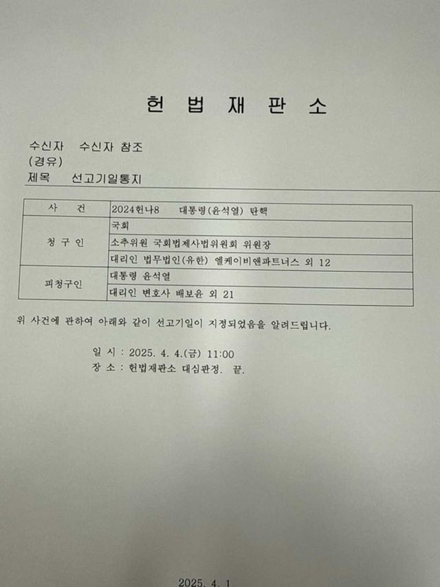 국회 법제사법위원회 위원장인 정청래 의원은 1일 자신의 SNS에 "4월 4일 오전 11시. 헌재 선고. 연락받았습니다"라고 전했다.