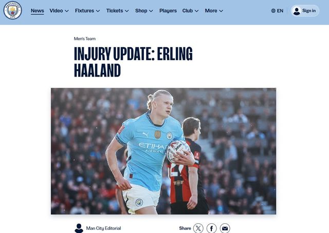 맨시티는 1일(이하 한국시각) 구단 공식 홈페이지를 통해 홀란이 왼쪽 발목 부상을 당했다고 공지했다.