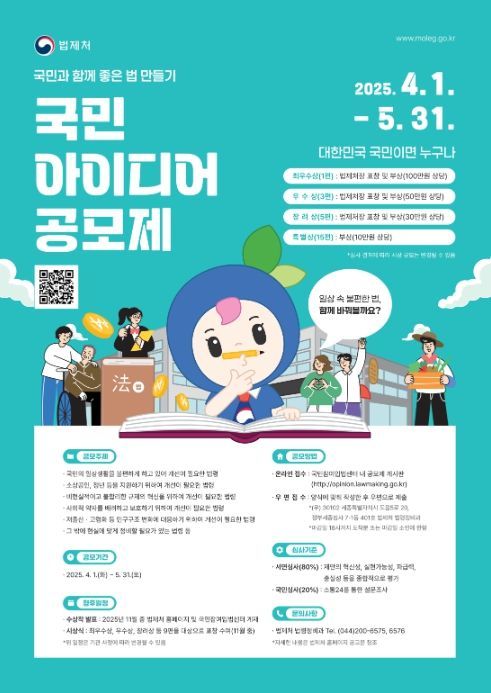 [와이뉴스] 법제처는 일상생활에 불편을 주거나 불합리한 법령을 찾고 개선하기 위해 ‘2025 국민 아이디어 공모제’를 4월 1일부터 5월 31일까지 개최한다.